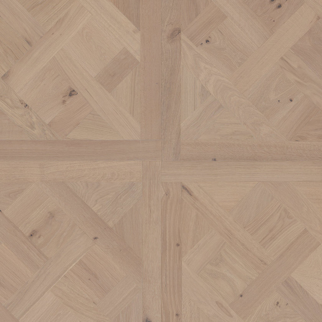 Built with a 4mm white oak veneer over a stable engineered core, Provincial Parquet blends natural wood character with structural strength. A wirebrushed finish enhances the grain for an authentic touch, while the UV aluminum oxide coating provides protection against everyday wear. Designed for glue-down installation, these panels ensure a secure fit and seamless parquet pattern across the floor.